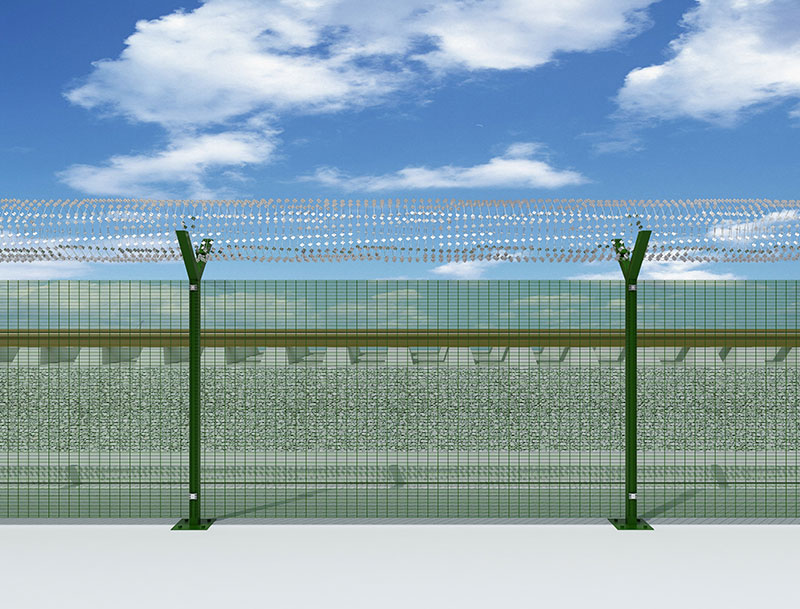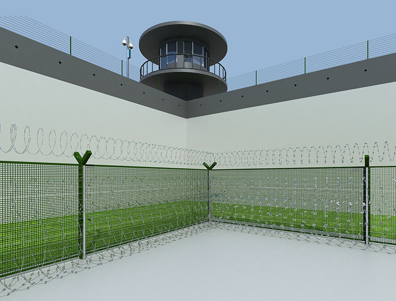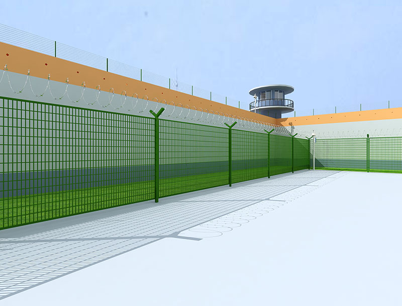 智慧监狱智能电焊网:为高强度高(大)丝径(高防腐镀锌)钢丝焊接而成,坚固耐用。在电焊网上方添加特制的刀刺滚笼,(电焊网顶端采用特制斧形刺刀圈组成整套物理围界,同时配合应变式传感器在起到物理防护的同时也能完成防入侵报警功能)配合应变式传感器在起到物理防护作用的同时也可以达到报警的功能。